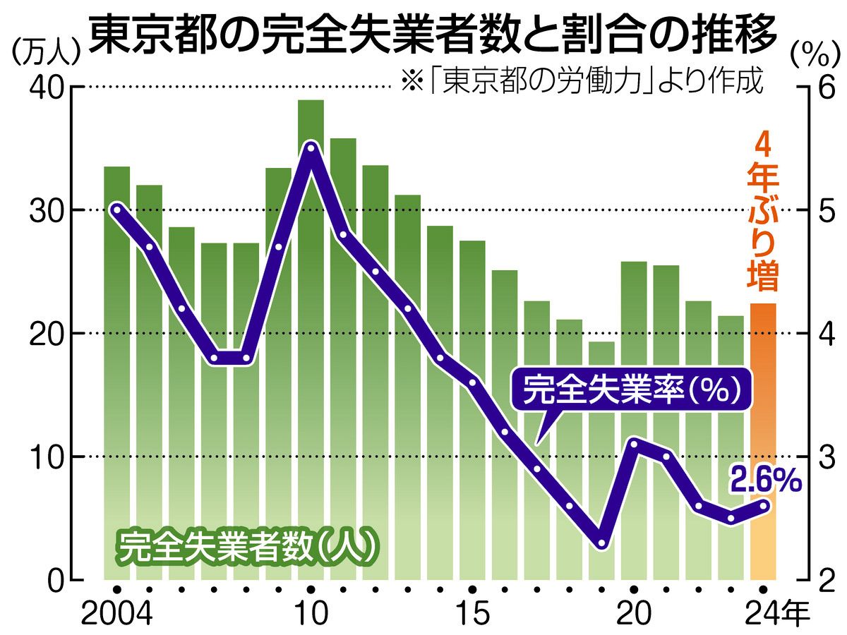 <深掘りこの数字> 総務省の「労働力調査結果」に基づいて東京都が算出している都の完全失業者数は、最新の2024年が約22万4000人だ...