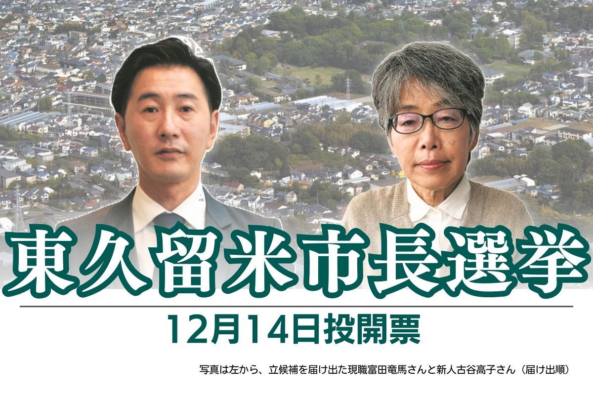 東京都東久留米市長選は7日、告示され、いずれも無所属の現職富田竜馬さん(48)=自民、公明推薦=と、新人で市民団体役員の古谷高子さん(...