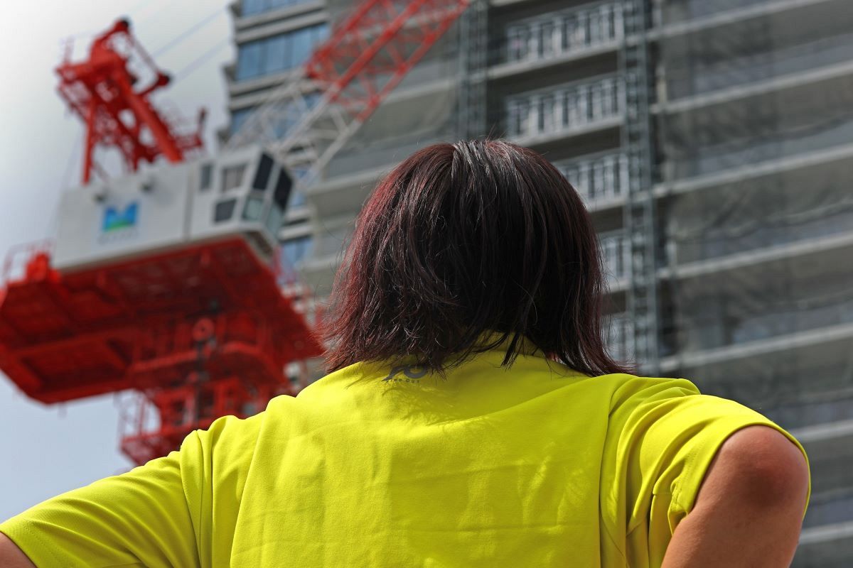 ニュー大崎の裏手に建設中のタワーマンションを見つめる沢田さん=東京都品川区で(平野皓士朗撮影)