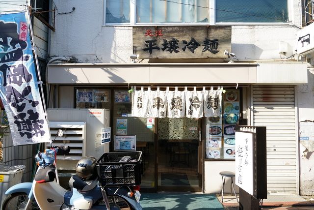 なんて感じで蒲田の鉄道史跡を巡りながら駅の方へもどってくると、池上線の線路端の「バーボンロード」という通りの一角に「元祖平壌(へいじょう)冷麺 食道園」の看板を出した店がある。北方にはアーケード街のサンロード蒲田が通る、小さな飲み屋が軒を連ねる蒲田らしい飲食街だ。