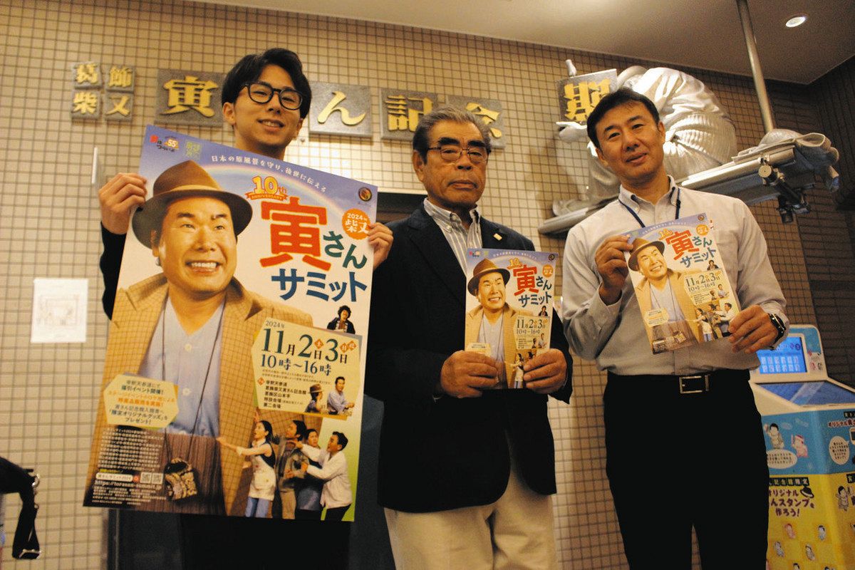 サミットをPRする斉藤勝治会長(中)=葛飾区柴又の寅さん記念館で