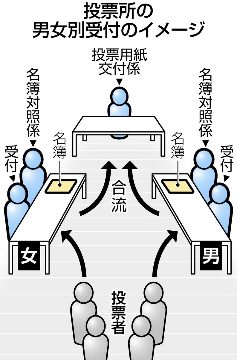 東京、千葉、埼玉、神奈川の1都3県の212自治体選管に取材したところ、千葉県の南房総市は投票所27カ所のうち12カ所、鋸南(きょなん)町は7カ所のうち1カ所が男女別受付だった。同県一宮、睦沢両町と東京都小笠原村は全投票所が男女別受付を設けていた。こうした投票所では「男」「女」と張り紙などをし、有権者を男女別に並ばせていた。