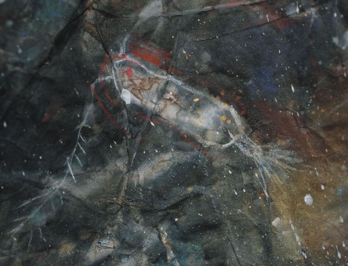絵に近づくと、原爆で汚染された土壌にクマムシや菌類、サンゴ片の「死の灰」が降った海面にはプランクトン類がうごめき、生命の躍動を感じさせる。