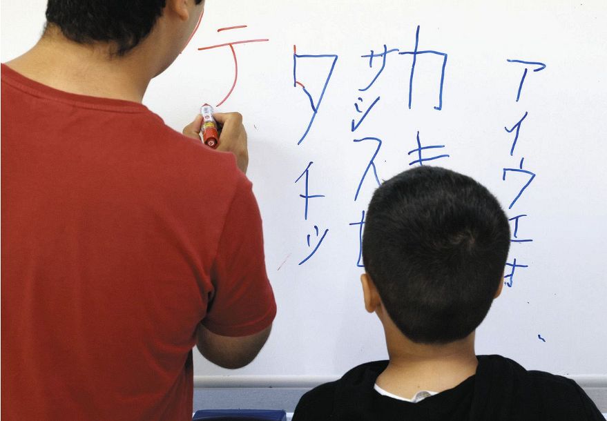 クルド人の学生アランさん(左、仮名)から日本語を教わるクルド人の子ども=埼玉県川口市のメタノイアの教室で