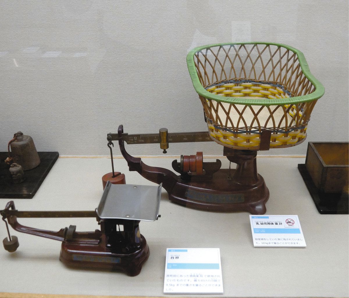 重さや容積を「量る」、時間や数を「計る」、長さや広さを「測る」の三つの「はかる」をテーマに、同館などが所蔵する資料計28点を展示。量る道具では、昭和の頃まで使われていたという「乳幼児用体重計」などを紹介する。助産師をしていた人の家に残っていた物で、体重10キロまで量れるといい、子どもを乗せる部分のかごが時代を感じさせる。明治以降に薬局で使われたという「台ばかり」も並ぶ。