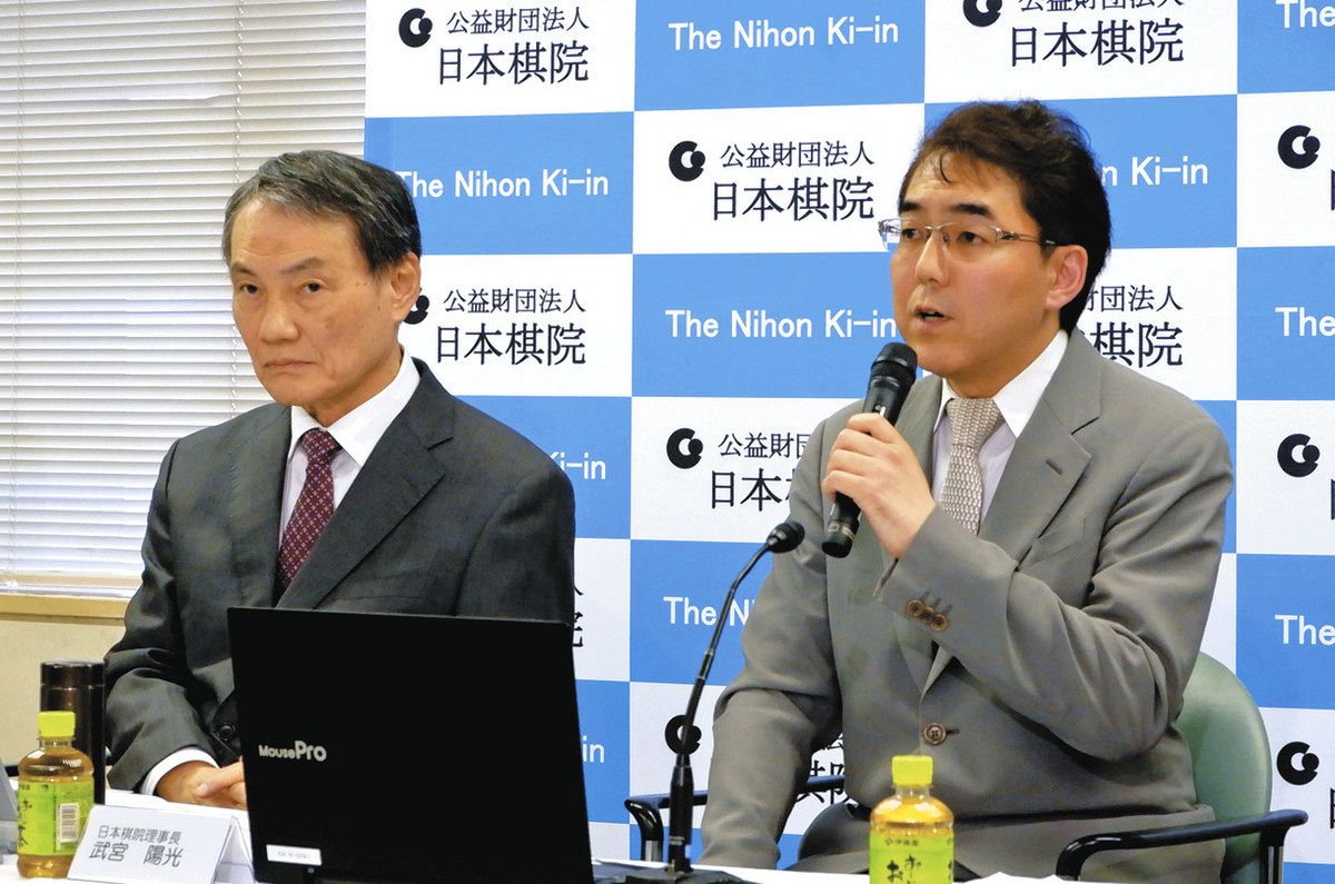 経営改革委員会の最終報告について記者会見する稲田修一副委員長(左)と武宮陽光・日本棋院理事長=東京都千代田区の日本棋院で