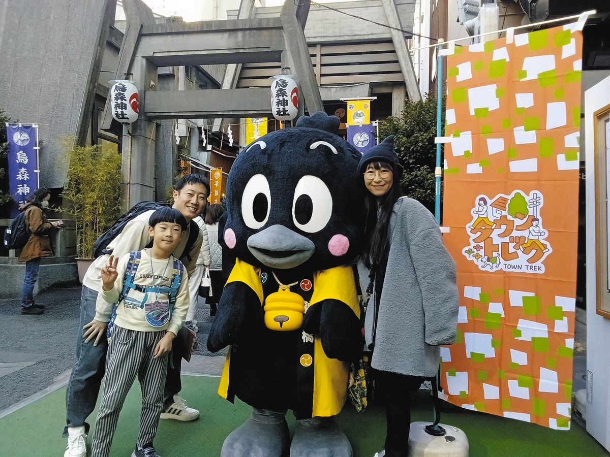 烏森神社の「こい吉」と写真を撮る参加者=東京都港区新橋