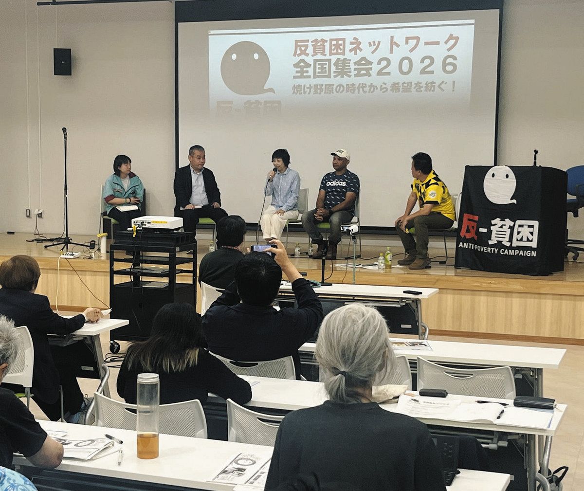 理事長の宇都宮健児弁護士は基調報告で「今ほど貧困と格差が広がっている状況はない。貧困は尊厳を奪い、時には命を奪う」とし、反差別などさまざまな市民運動との連携をアピールした。瀬戸大作事務局長は相談・支援のケースで、女性が2020年度の52人から25年度には305人と急増するなど、複合的で深刻な相談が増えており「福祉事務所などと連携した長期的な伴走が必要になっている」と指摘した。