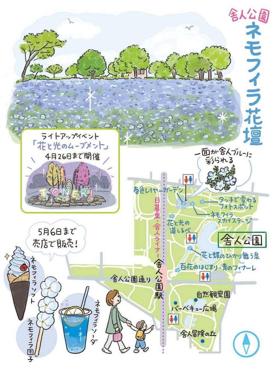 都内でも有数の広さを誇る「舎人公園」は足立区の北西部に位置します。春の訪れとともに約65haもの開放的な敷地を鮮やかな色彩に染め上げるのは約3万5千株のネモフィラ。4月中旬から下旬にかけて園内は幻想的な青の世界に包まれます。この時期にしか出会えない、ネモフィラのブルーが織りなす貴重な景観は必見です。